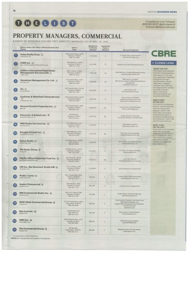 “This year’s ranking is the product of a lot of hard work, and a relentless dedication to customer service and quality,” said President/CEO, Steven Sofos “our book of business is a testament to the fact, that we have the best commercial property management team in Hawaii.”